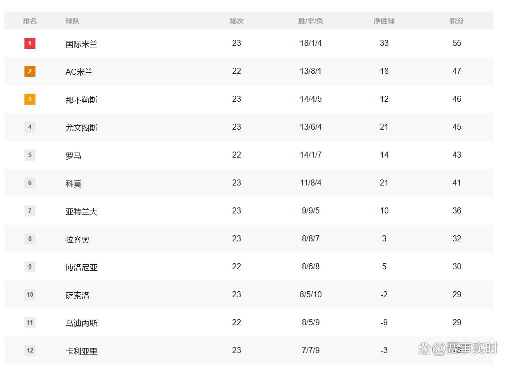 由于本轮比赛AC米兰尚未出战,国米在23轮过后积分达到55分,多赛一场的情况下,已经领先排名第二的AC米兰8分之多。在积分榜上,尤文图斯本轮4比1大胜后积分达到45分,升至第四,但那不勒斯(46分)、罗马(43分)等队与国米的差距依然明显。对于克雷莫纳来说,这场失利让他们最近9轮联赛3平6负难求一胜,继续排在积分榜第15位。